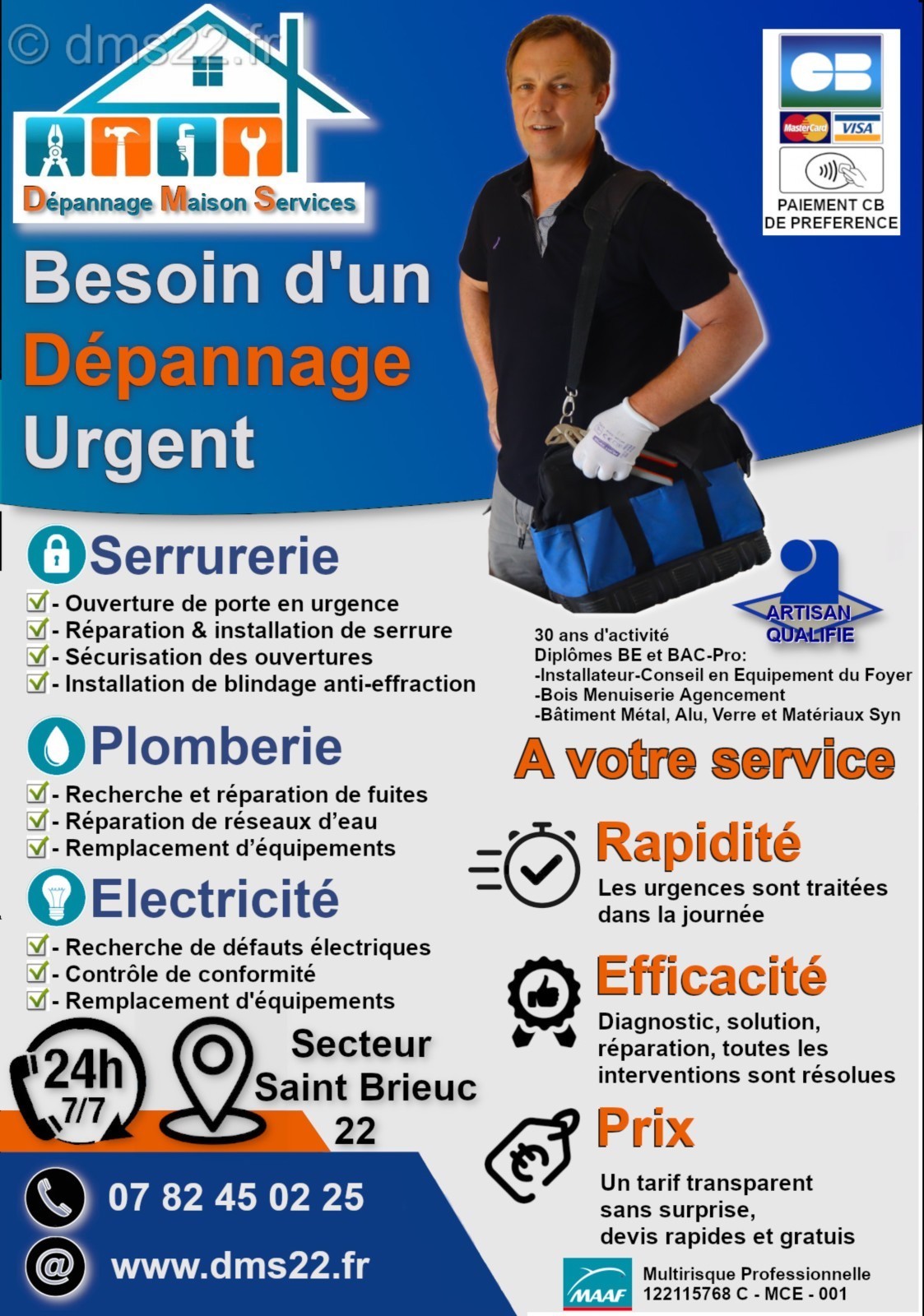 Des clés perdues, une fuite d’eau, un défaut électrique, une serrure à changer, une fenêtre à régler, un volet bloqué, un robinet qui ne fonctionne plus, des canalisations bouchées, un disjoncteur défectueux... DMS est le spécialiste des services d’assistance (dépannage d'urgence et réparation, ) pour votre maison.